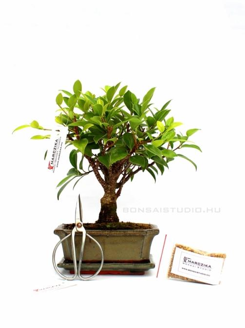 Ha valami különlegeset keres- ajándékozzon szeretteinek bonsait a hozzá tartozó kiegészítőkkel! Az ajándékcsomag tartalmaz egy 15B (15cm-es tálba ültetett, gömb koronás) Ficus retusa- Fikusz bonsait, a tálhoz tartozó (méretben és színben megegyező) alátétet, egy kis méretű bonsai ollót a bonsai metszéséhez és alakításához, valamint egy kis csomag drazsírozott műtrágyát, mellyel hosszú ideig biztosítható a bonsai tápanyag utánpótlása.