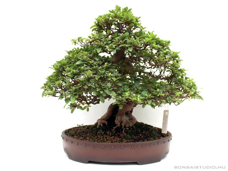 Kifu méretű (20 cm től-35 cm ig ), moyogi stílusú Kaho Rhododendron Indicum, érdekessége, hogy a gyökérnyakon shari található. Fagyálló, barna mázatlan bonsai-tálban.